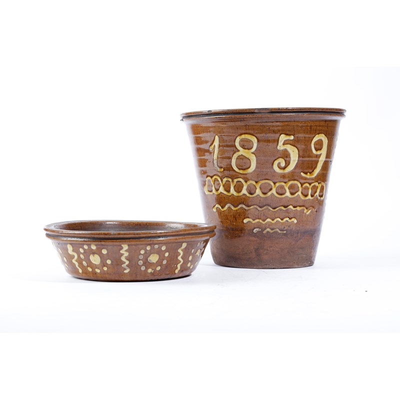 with a brown glaze and cream decoration with dot rondels, a stylised tree, a ring chain border and wavy lines, dated '1859', with a matching tray (2)