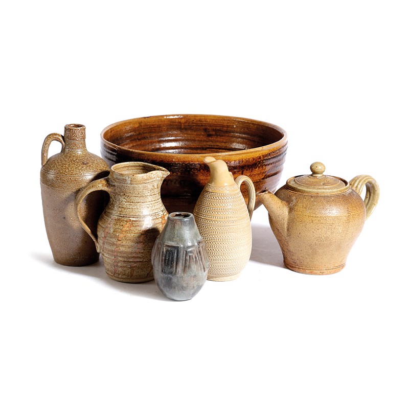 including: a footed bowl by Newlyn Harbour Pottery, a teapot by A & J Young and a jug by Biddy Picard of Mousehole Pottery (6)