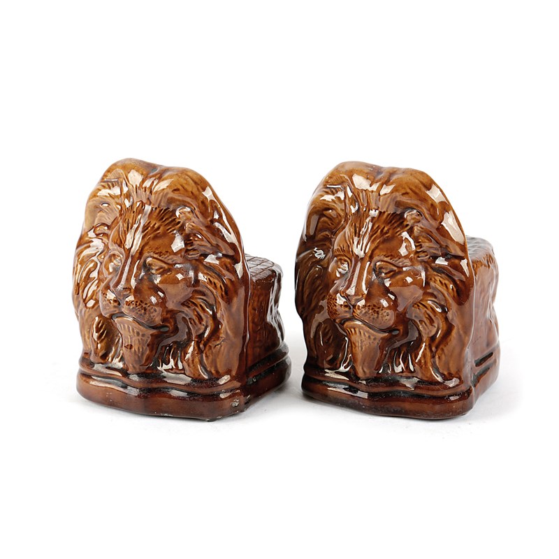 A PAIR OF POTTERY LION SASH WINDOW / FURNITURE RESTS
