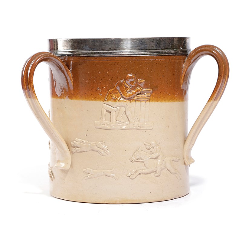 with a silver plated rim above a brown wash, with three scroll handles, the body applied with relief moulded hunting figures, a windmill and men drinking ale