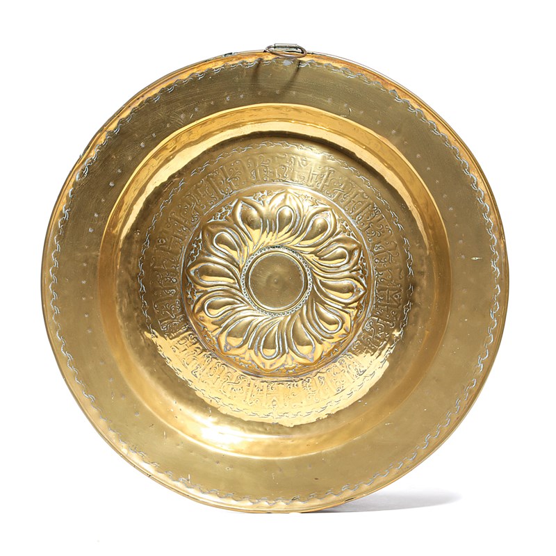 the centre with a repousse whorl boss within a band of Gothic script and with a punched outer border