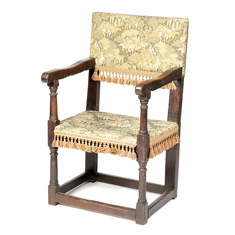A CHARLES II OAK AND UPHOLSTERED ARMCHAIR
