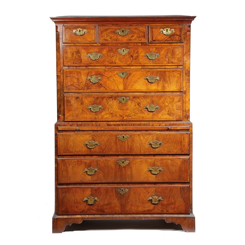 with three short and six long feather banded drawers, with brass plate bat's wing handles and escutcheons and fitted with a brushing slide, stamped 'E. Hancox', on shaped bracket feet