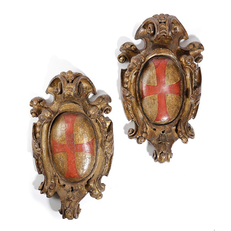 each with an oval armorial, painted with a red cross, in a leaf scroll frame (2)