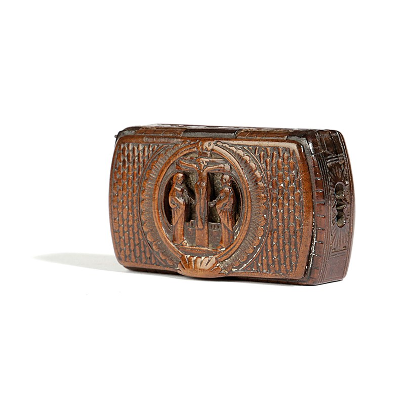 the hinged lid carved with the crucifixion, the body with pierced panels, the interior with a paper lining and silk backing