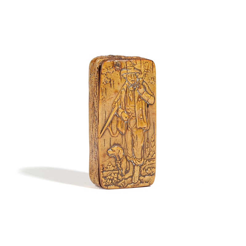 with pressed decoration, the hinged lid with a huntsman smoking his pipe and carrying a rifle, accompanied by his dog, the body with a band of oak leaves and acorns, with a bark lined interior, the base with a strike