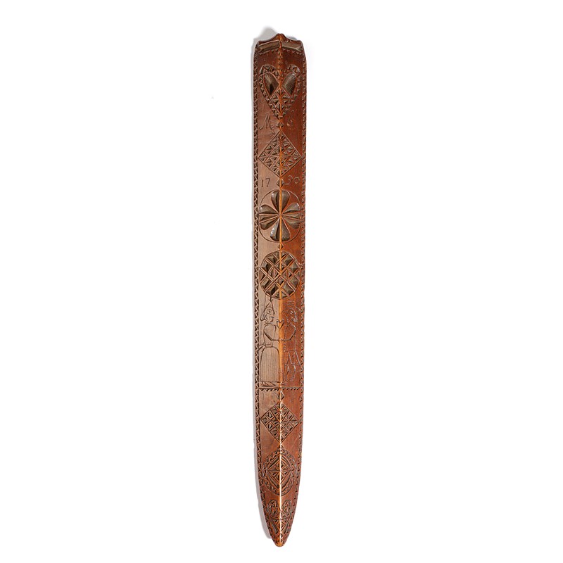 with chip carved decoration, engraved with initials 'M H' and the date '1790', above a courting couple with a loveheart, the back inscribed 'my hart his...cannot range I like my choice to well to change 1790'