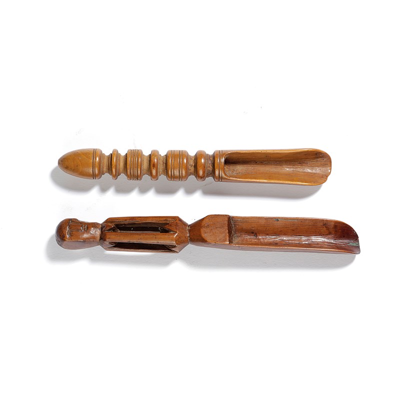 one of boxwood, with a turned handle and dated '1671', the other with a carved head handle above a cage, possibly Welsh (2)