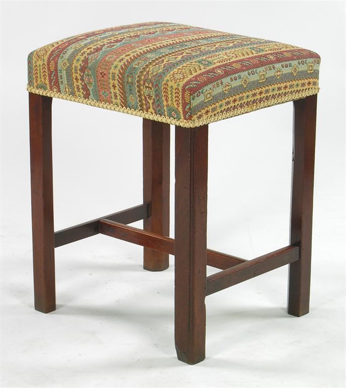 A mahogany rectangular stool, the stuffed over top on George III mahogany moulded square chamfered legs united by an 'H' stretcher, 22in (55.8cm) h, 17.5in (44.5cm) w, 15.75in (40cm) d.