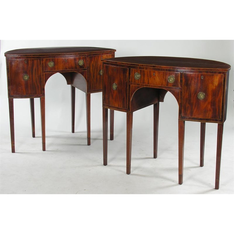 A pair of Regency mahogany eliptical sideboards, with boxwood edging, a central frieze drawer above an arch flanked by cupboard doors, fitted later brass plate handles on square tapering legs with banded ankles, 36.5in (92.6cm) h, 42.25in (107.3cm) w, 25.25in (64cm) d. (2)