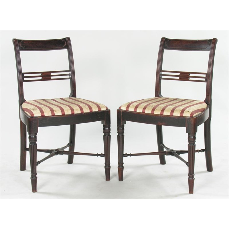 A pair of late Regency side chairs, the reeded open horizontal bar backs to bowfront drop in seats on turned and ribbed legs united by a turned and block 'X' stretcher. (2)