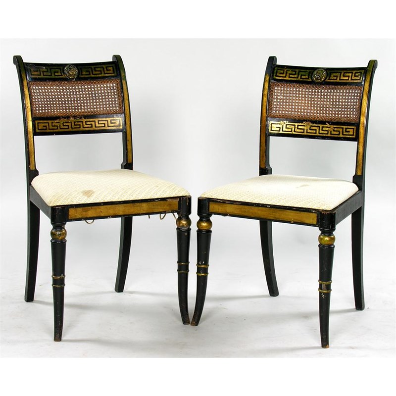 A set of 19th century painted side chairs, the open caned backs with Greek key borders and applied lion masks, the caned seats with later cushions, on turned splay legs. (6)