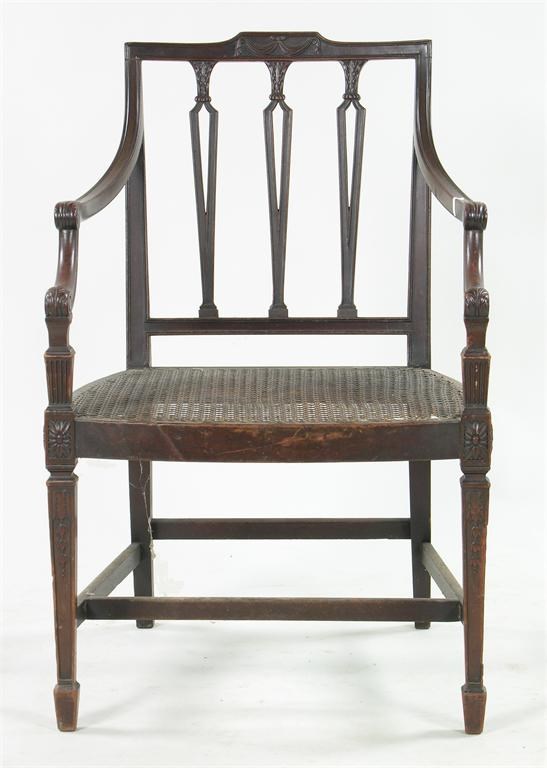 A 19th century mahogany open armchair, the top rail carved ribbon tied drapes above three open vertical rails with acanthus carved terminals, the arms with double acanthus terminals on fluted supports, the caned bowfront (repaired) seat, on floret headed and pinched square tapering legs united by an 'H' stretcher to spade feet.