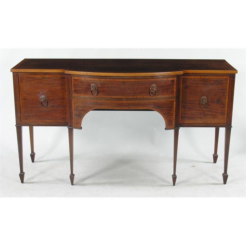 An Edwardian mahogany breakfront bow sideboard, with satinwood crossbanding and stringing above a central frieze drawer with brass trade label for ' HEWETSON , MILNER & THEXTONS LTD, HOUSE FURNISHERS , 200, 203, 204, 211, 212, 213, 214 215 TOTTENHAM CT ROAD LONDON W,' to an arch, flanked by a cupboard door and a deep drawer with bottle division, on square tapering legs to spade feet, 35.75in (90.8cm) h, 65.5in (166.2cm) w, 26.75in (68cm) d.