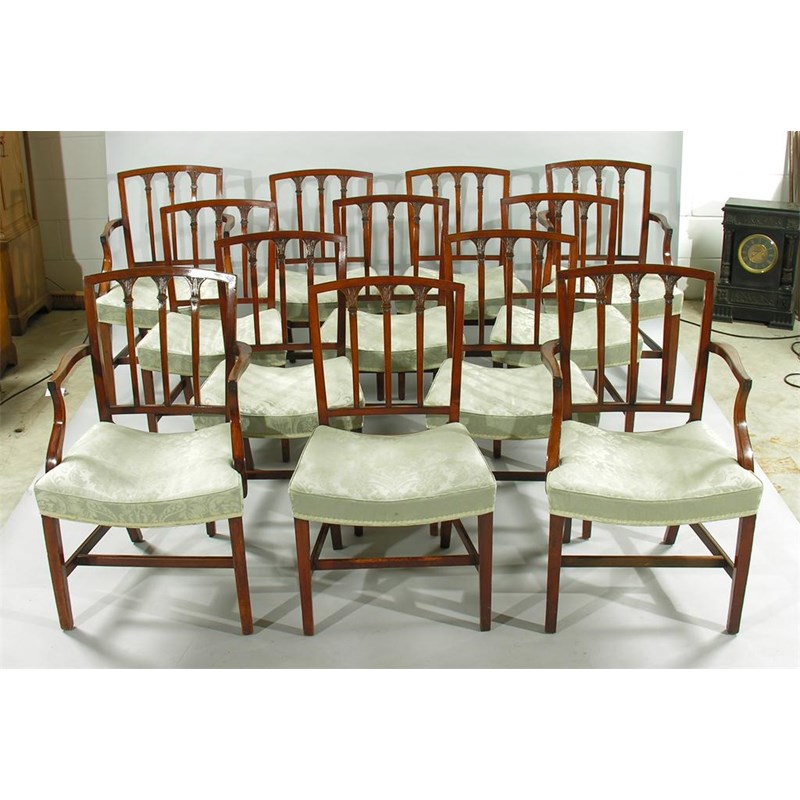 A set of twelve Sheraton period mahogany dining chairs, the curved top rail above three vertical rails with carved acanthus and floret capitals, the dipped stuffed over seats on square legs united by 'H' stretchers, comprising: four open armchairs with floret terminals and eight side chairs. (12)