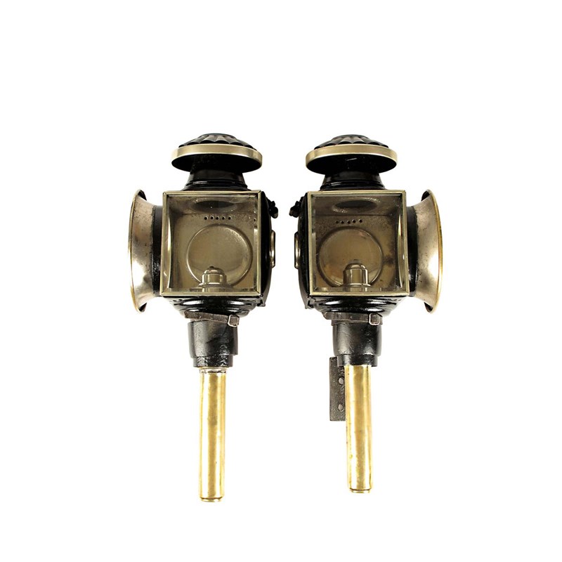 A pair of ebonised tin and brass coaching lamps, with later wall mounts, 18in (46cm) h. (2)