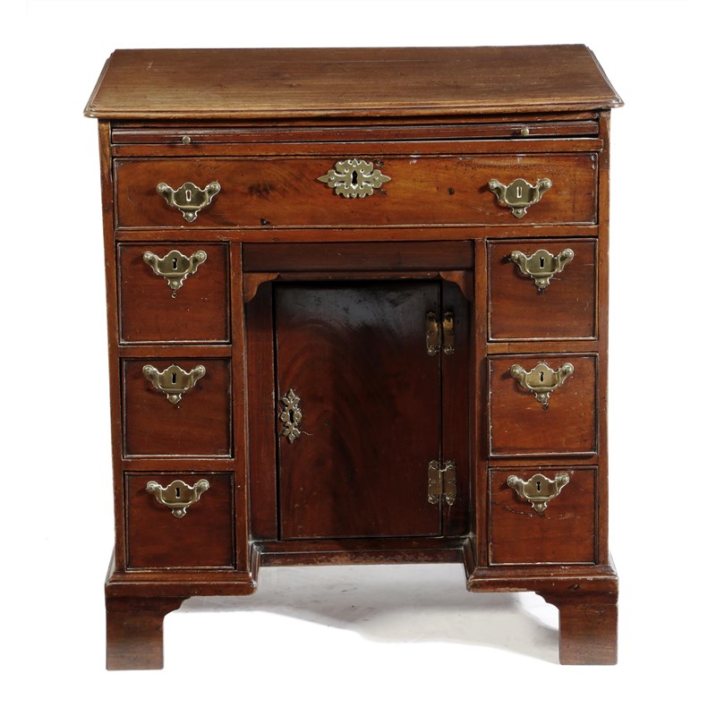 An early George III mahogany kneehole desk, fitted with a plush lined brushing slide, above an arrangement of eight drawers, around a central cupboard, on later bracket feet, 80cm high, 73.2cm wide, 47cm deep.