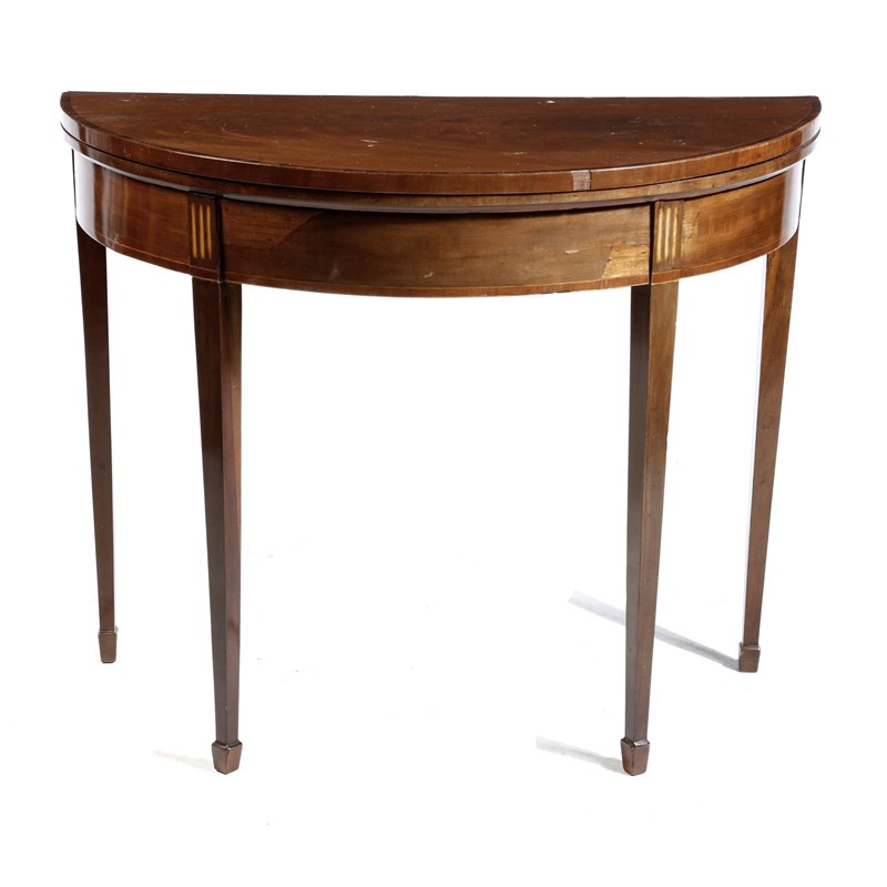 A George III mahogany demi-lune card table, with a crossbanded fold-over top, on square tapering legs, with faux fluted panels and spade feet, 73.5cm high, 90cm wide, 44.5cm deep.