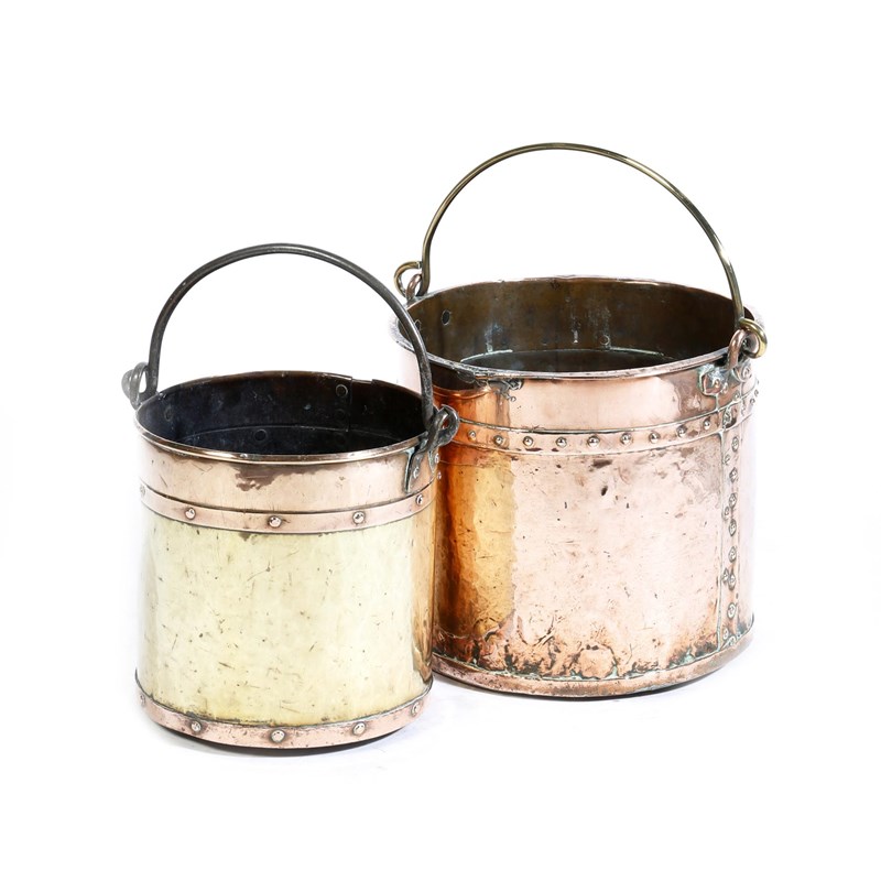 A 19th century Dutch copper and brass logbin, with a swing handle and a riveted body, together with a similar, smaller example, 32.5cm high, 39.9cm wide (max). (2)