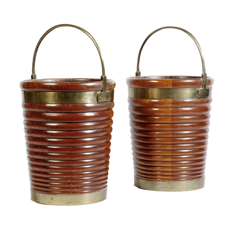 A pair of Regency style mahogany and brass mounted peat buckets, each with a swing handle and a ribbed tapering body, 46cm high, 35.5cm wide. (2)