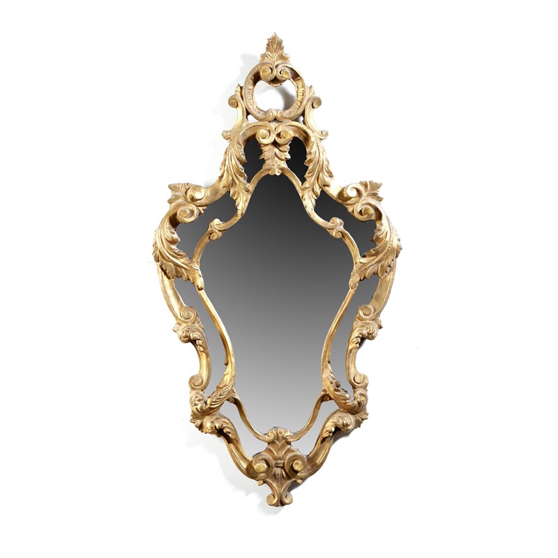 A pair of Italian giltwood wall mirrors in 18th century style, of cartouche shape, with marginal plates, the frames carved with scrolls and leaves, late 19th / early 20th century, 106 x 56.5cm. (2)