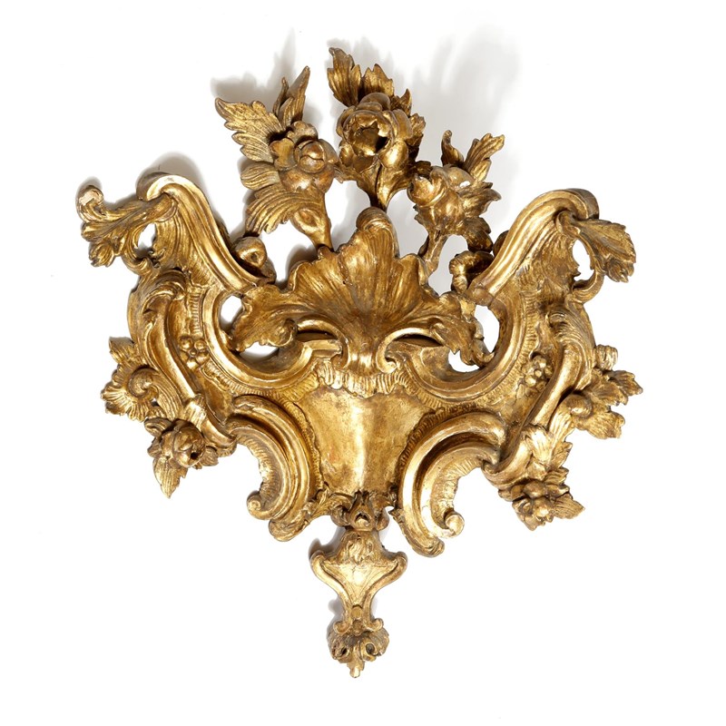 A pair of 18th century Italian giltwood corner appliques, carved with flowers, rocaille, scrolls and a shell, 65.8cm high, 54cm wide. (2)