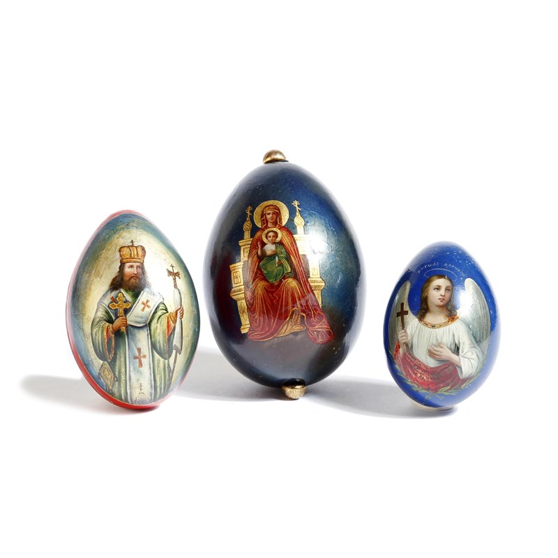 Three late 19th century Russian papier-mâché Easter eggs, comprising a gilt metal mounted example by Lukutin , painted with the Virgin & Child, the base with an Imperial Spread Eagle mark, together with a smaller Lukutin example, painted with the Angel Gabriel and flowers, in two halves and another egg painted with a bishop and the Kremlin, in two halves, 10.7cm high (max). (2)