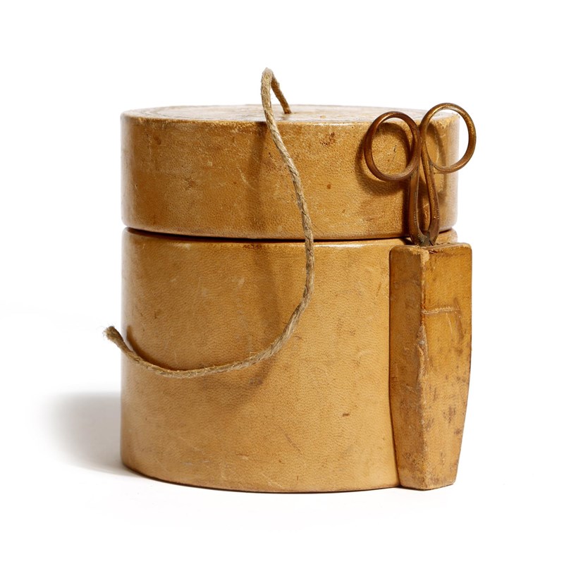 A leather string box, with gilt tooled decoration, the lift-off top revealing a marbled paper interior and with a pair of scissors, 14.4cm high.
