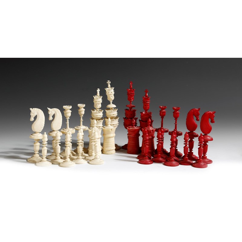 A Selenus type bone chess set, natural and stained red, the monarchs with carved busts and cross finials, German or central European, early to mid-19th century, the king: 11.9cm high, the pawn: 4.5cm high. (32)