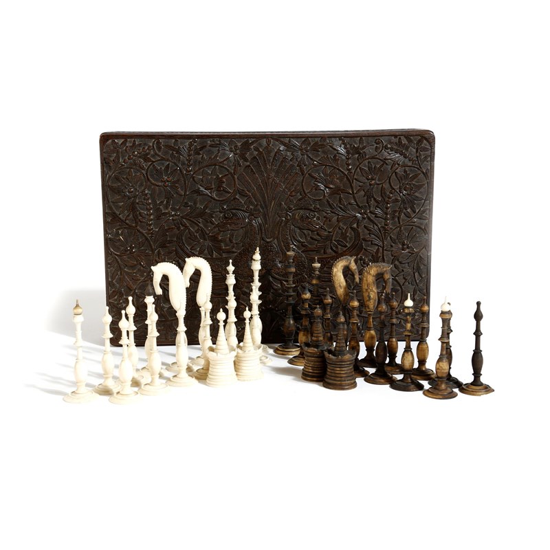 A German Selenus pattern turned bone chess set, natural and stained, the king: 8.5cm high, the pawn: 6.2cm high, early 19th century, in an Indonesian Jepara carved wood box. (33)