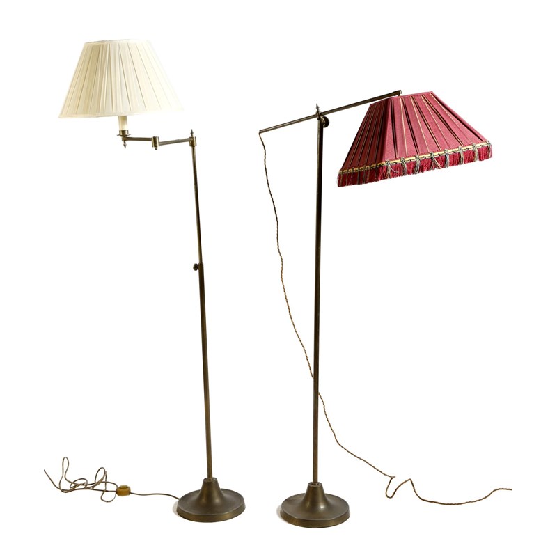 Two similar brass adjustable reading lamps, each with a bronze finish and with a pleated silk shade, 162.4cm high (max). (2)