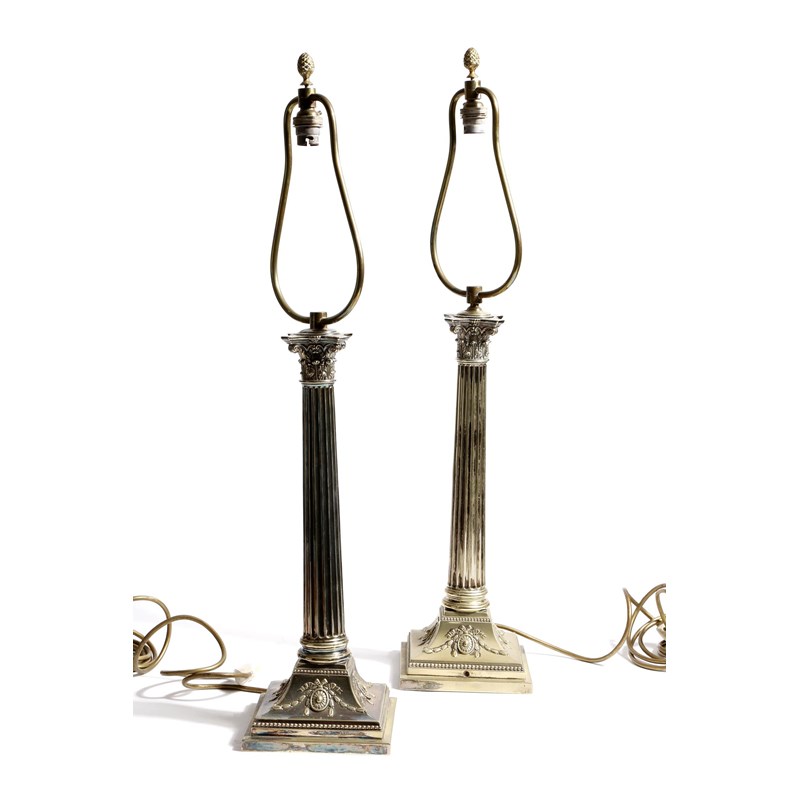 A pair of Edwardian silver plated Corinthian column table lamps
