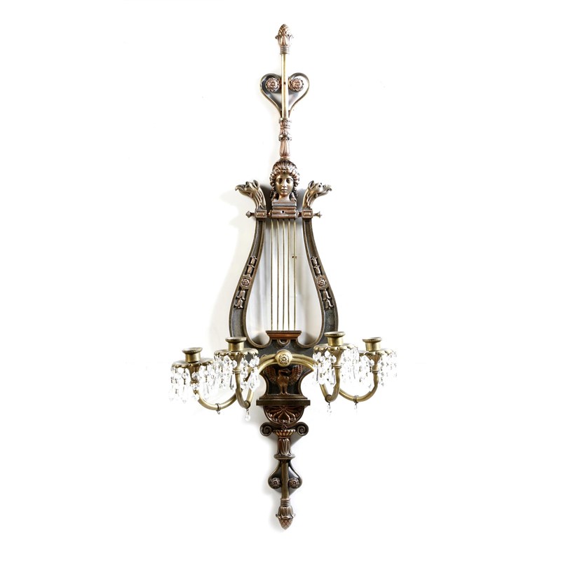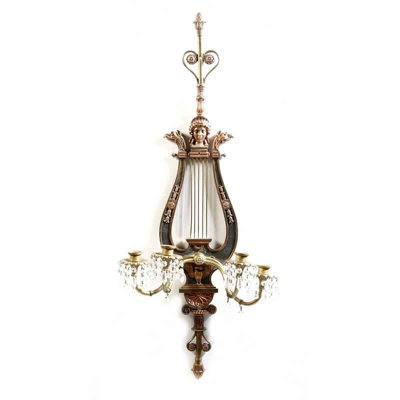 A pair of Empire style brass and copper lyre wall appliques, decorated with eagles' heads, a female mask, husks and anthemion motifs, with four lights, hung with cut glass drops and lustres, 100.5cm high, 42.5cm wide. (2)