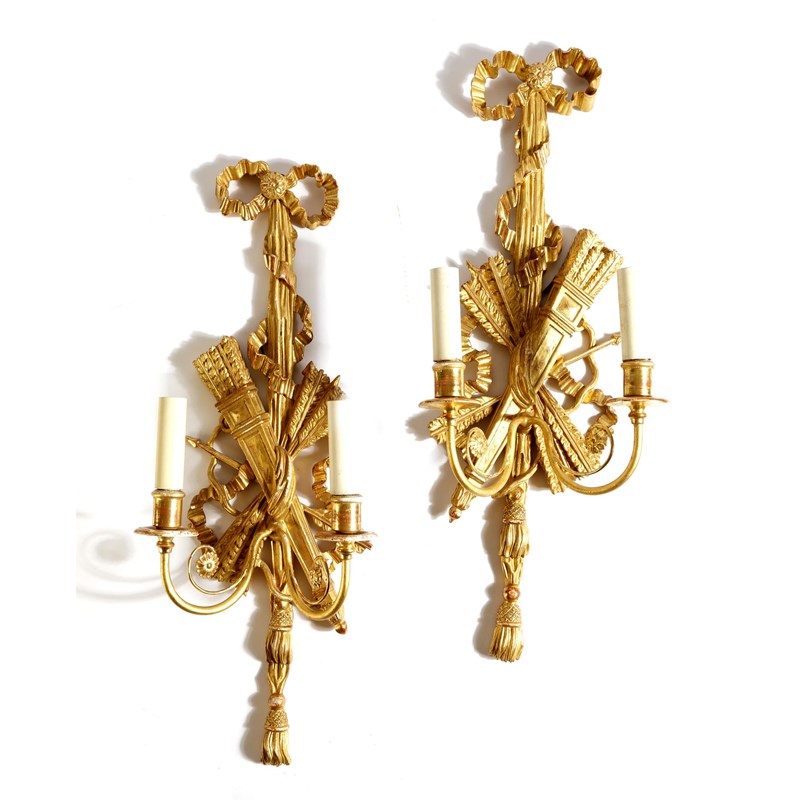 A pair of Italian giltwood twin-light wall appliques in Louis XVI style, each with a ribbon tied quiver of arrows backplate, with scroll branches, 20th century, 62cm high. (2)