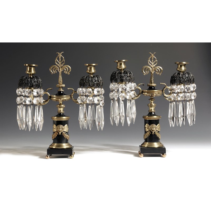 A pair of 19th century patinated bronze and brass twin-light lustre candlesticks