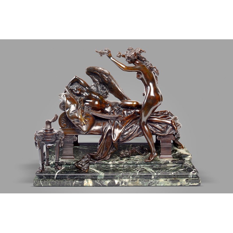 Albert-Ernest Carrier-Belleuse (1824-1887) was a pupil of David d'Angers and was one of the founding members of the Société Nationale des Beaux-Arts. He is probably most well known for the fact that Auguste Rodin worked as his assistant between 1864 and 1870. The story of Cupid and Psyche is originally from Metamorphoses and concerns itself with the obstacles of love between Psyche (Soul) and Cupid or Amor (Desire/Love) and their eventual sacred marriage. The bronze depicts the moment when Psyche (who was told by her sisters that Cupid was a vile winged serpent) uses a lamp to see Cupid and kill him, but when the light reveals such a beautiful creature she startles and subsequently wounds herself on one of Cupid's arrows. Struck with a feverish passion she spills hot oil from the lamp and wakes him.