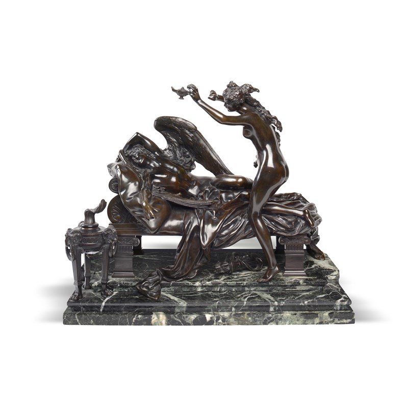 Albert-Ernest Carrier-Belleuse (French 1824-1887). A bronze group of Psyche awakening Cupid, signed 'A. CARRIER-BELLEUSE', mounted on a verde antico marble base, 44.3cm high, 53.1cm wide.