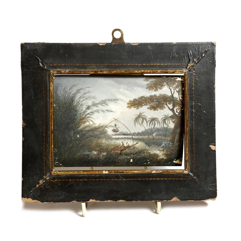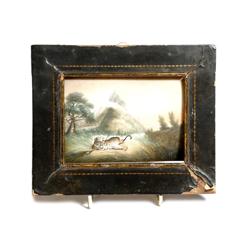 λ Indo-Chinese School. A pair of late 19th century watercolours on ivory, depicting tigers in landscapes, 9.5 x 13.5cm, each in a gilt and ebonised frame. (2)
