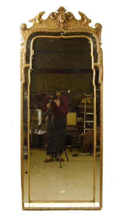 A George I style giltwood pier mirror, the divided central bevelled plate to a marginal outer border, the leaf carved frame centred a female mask with eagles head corners, 78.5 x 32in (199.5 x 81cm).
