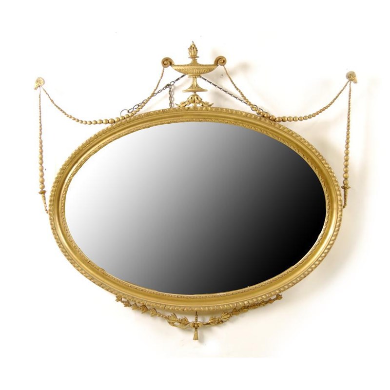 A late Victorian giltwood and gesso oval wall mirror, having a bevelled plate and gadroon edge, with a flaming urn surmount issuing beads with rams head terminals, the base with laurel swag, 34 x 34.5in (86.3 x 87.6cm). Repairs to some beads.