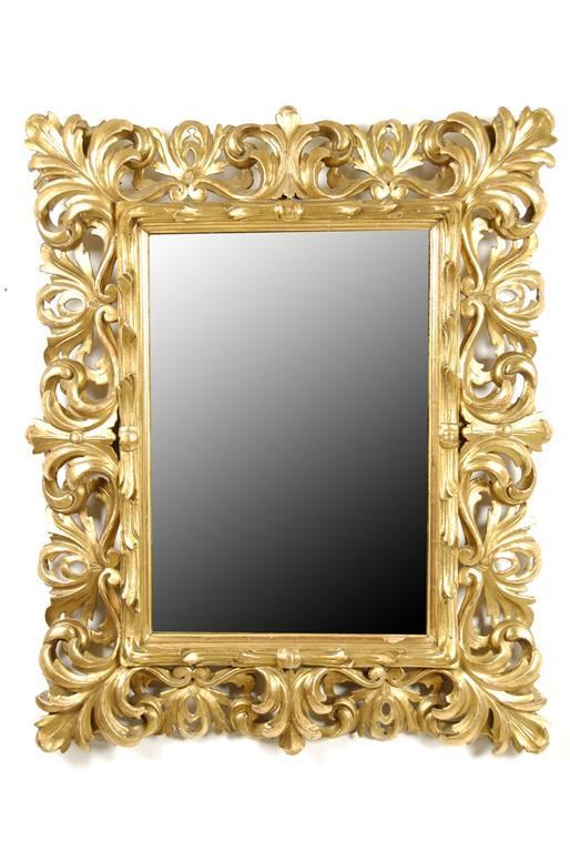 A carved giltwood Florentine wall mirror, with a rectangular plate and a layered leaf scroll border, 32 x 26in (81.5 x 66cm).
