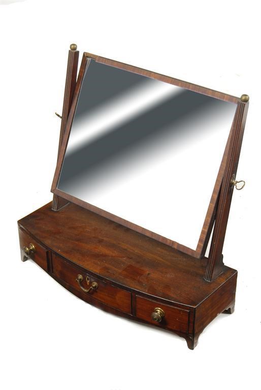 An early 19th century mahogany dressing table mirror, the replaced plate to reeded uprights, the bowfront base fitted three cedar lined drawers, 22.5in (56.9cm) h, 22.75in (57.6cm) w. Replacements and restorations.