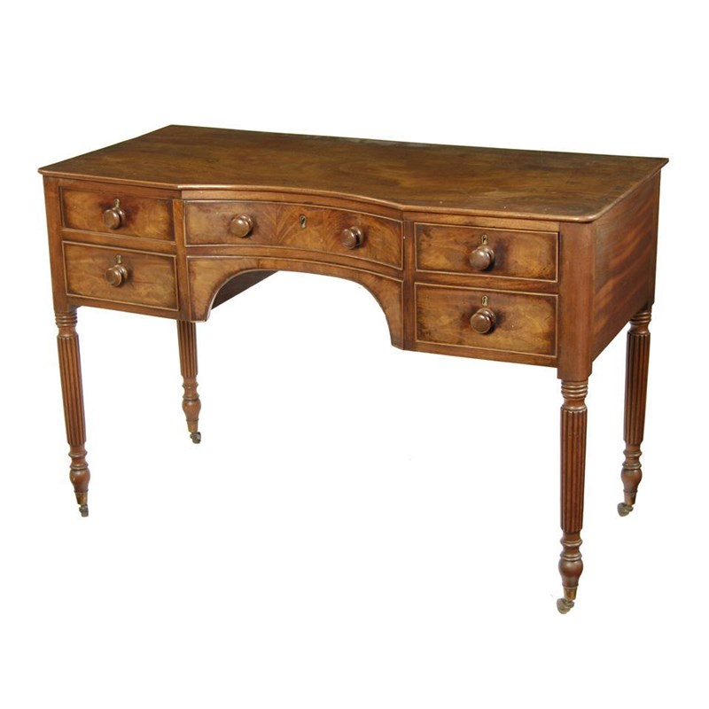 A George IV mahogany dressing table, with a concave centre drawer flanked by two short drawers to either side, on ring turned reeded legs on brass caps and castors, 30.25in (76.7cm) h, 45in (114.5cm) w, 21.25in (54cm) d.