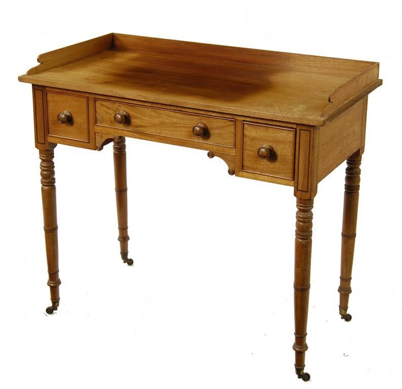 An early 19th century mahogany washstand, with a 3/4 gallery above three drawers on ring turned legs to brass caps and castors, 35.5in (84.9cm) h, 38in (96.5cm) w, 20.25in (51.3cm) d. Sun bleached.