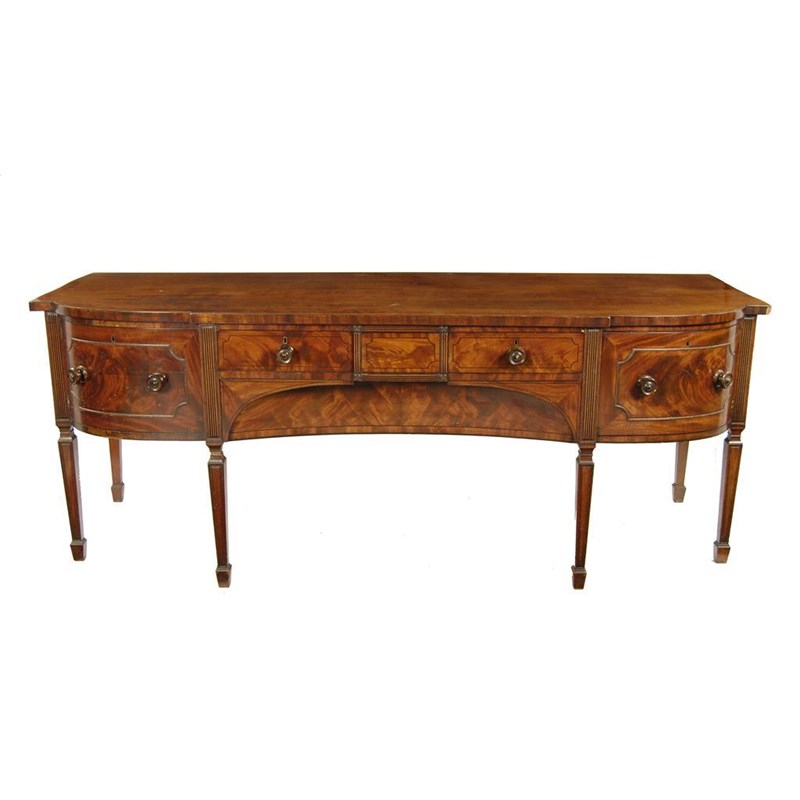 A large Regency mahogany barrel front sideboard, inlaid ebony stringing with two frieze drawers, one with a dummy front above a concave drawer, flanked by two cupboard doors, with reeded decoration and on panelled square tapering legs to spade feet, possibly Scottish 36.25in (92cm) h, 93.75in (238cm) w, 34.75in (88.3cm) d. Cracks to top and drawers, veneer loss, one leg off but present.