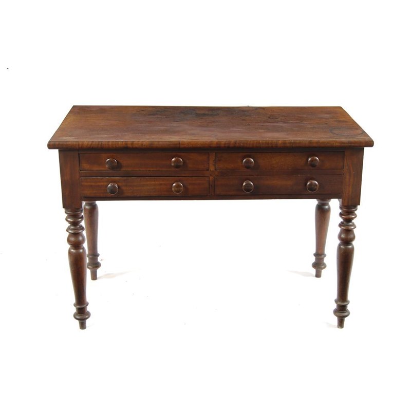 A Victorian writing table, fitted with four frieze drawers, on turned tapering legs, 30.25in (76.8cm) h, 44.5in (112.8cm) w, 22.5in (57cm) d. Section of moulding missing, crack to top.