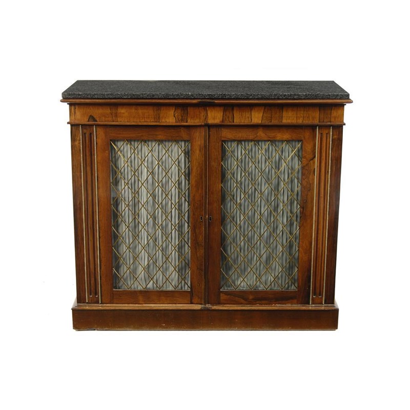 A rosewood television cabinet, the grey and black granite top above a pair of brass grille and pleated silk doors enclosing a shelf, 38in (96.5cm) h, 43in (109cm) w, 15.75in (39.9cm) d. Adapted from a chiffonier.