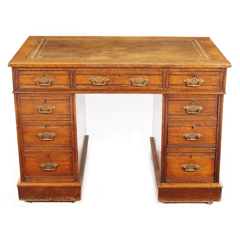 A late Victorian oak small pedestal desk, the top inset a later gilt tooled leather, above three frieze drawers the central one with stencil stamp 'From S & H Jewells, Furniture Warehouses 29, 30 & 31 Little Queen Street Holborn', above three drawers to each pedestal all fitted brass handles, the back pedestals with rectangular panels, the plinths on iron castors, 30in (76cm) h, 42in (107cm) w, 26.75in (67.5cm) d.