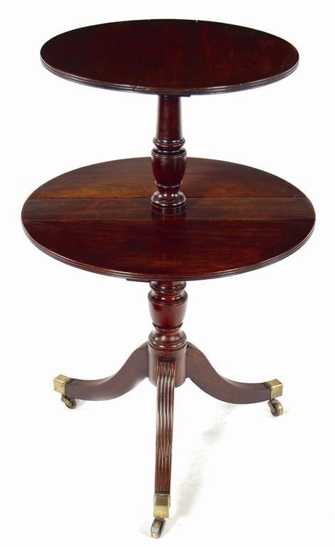 A George III mahogany dumb waiter, with two reeded edge folding tiers on a vase turned stem to reeded downswept supports, brass caps and castors, 36.75in (93.4cm) h, 23.75in (60.3cm) d.