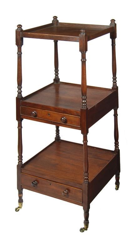 A mahogany whatnot of tapering form, with three tiers and turned baluster supports, fitted two drawers on brass caps and castors, 19th century and later, 47.5in (120.5cm) h, 20in (50.8cm) w, 20.25in (51.3cm) d. Restorations and replacements.